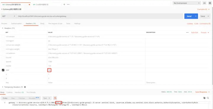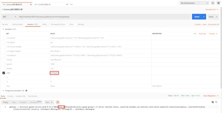 - 当传递的Http Header中user=zhangsan,满足条件之一,当全链路调用中,API网关负载均衡discovery-guide-service-a服务到1.1版本后再去调用discovery-guide-service-b服务,不满足version=1.0的条件,最终调用在discovery-guide-service-b服务端被拒绝掉