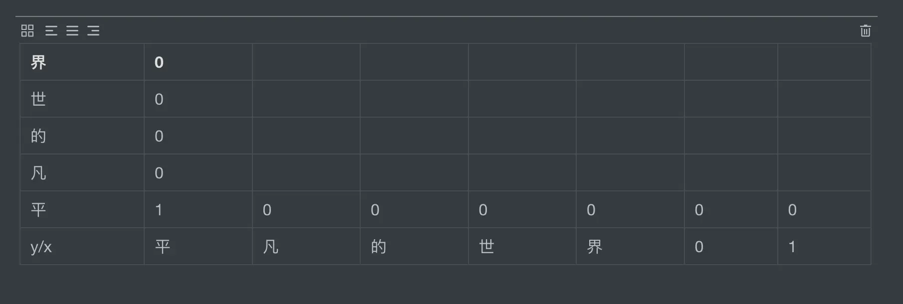 当y为1的时候,为 "平", 那么对应的 x轴上的字符,如果相同的话设置为1。