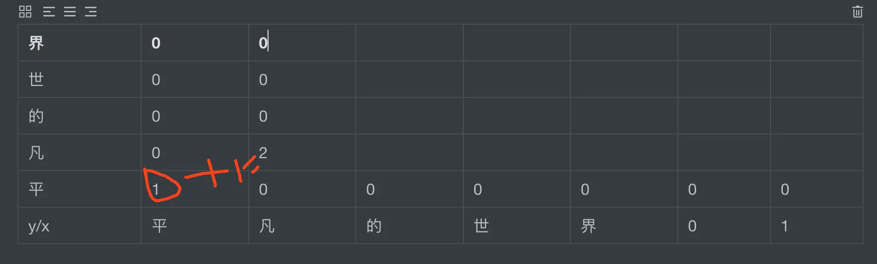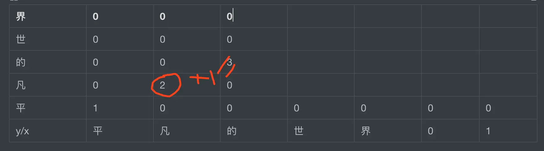 当x为2的时候,为 "凡", 那么对应 y轴上的字符,如果相同的话,查看 x-1,y-1 对应的数字大小加1,标注后如下图三