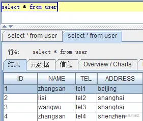| 4 | zhangsan | tel4 | shenzhen |