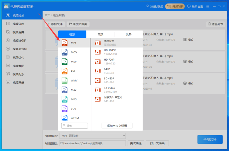 2、添加好视频后选择视频的“输出格式”,此时需要设置输出的视频格式和输出的视频分辨率,设置时注意把输出格式设置为常用的mp4。