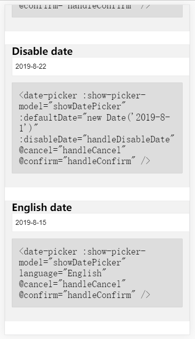 | confirm | 点击确认按钮触发,回调参数为选中日期如('2018-8-8') | --- |