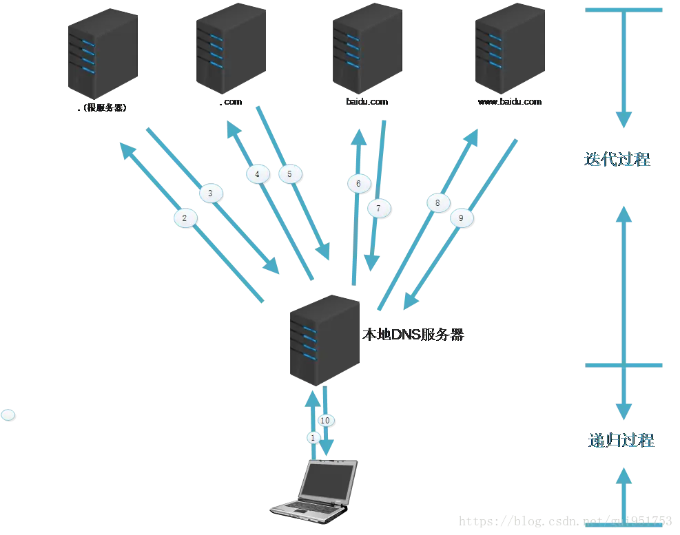 4、根DNS服务器没有记录具体的域名和IP地址的对应关系,而是告诉本地DNS服务器,你可以到域服务器上去继续查询,并给出域服务器的地址。这种过程是迭代的过程。