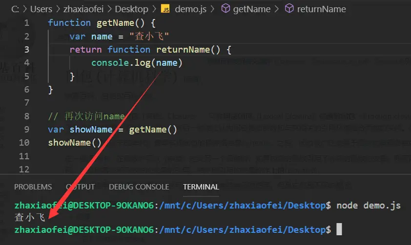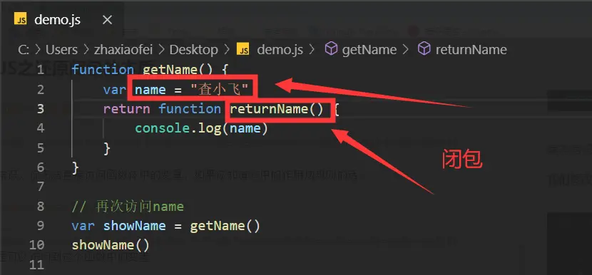 在第二段代码中,函数是 returnName ,这个函数引用的自由变量是 name。