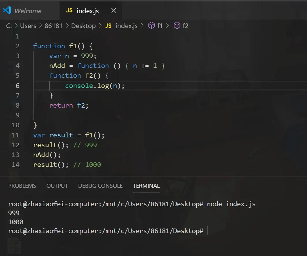 result实际上就是闭包f2函数。它一共运行了两次,第一次的值是999,第二次的值是1000。这证明了,函数f1中的局部变量n一直保存在内存中,并没有在f1调用后被自动清除。