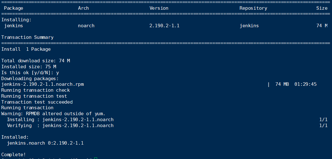rpm --import https://pkg.jenkins.io/redhat-stable/jenkins.io.key3、下载安装yum install jenkins #默认安装最新版,等待安装时间较长,约25minjenkins安装完毕