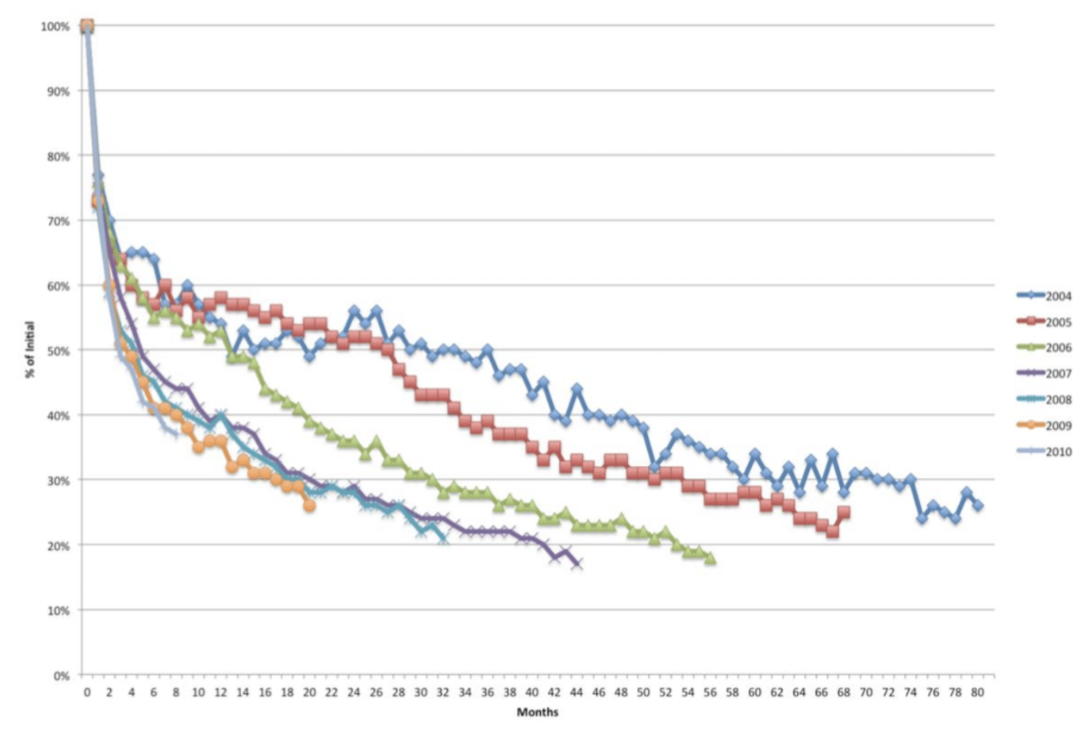 下图显示的是每年的时间群组下在一段时间之后的留存率