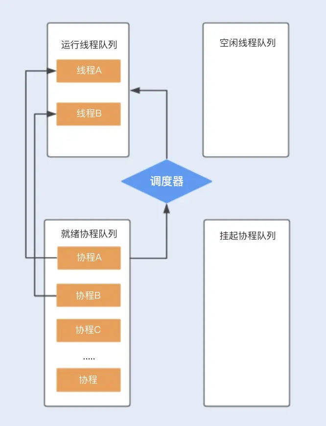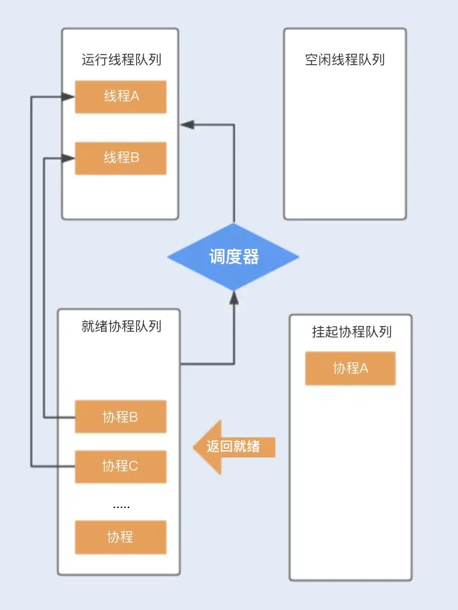 当协程 A 调用暂停方法或被阻塞时,协程 A 会进入到挂起队列,调度器会调用等待队列中的其它协程抢占线程 A 执行。当协程 A 被唤醒时,它需要重新进入到就绪队列中,通过调度器抢占线程,如果抢占成功,就继续执行协程 A,失败则继续等待抢占线程。
