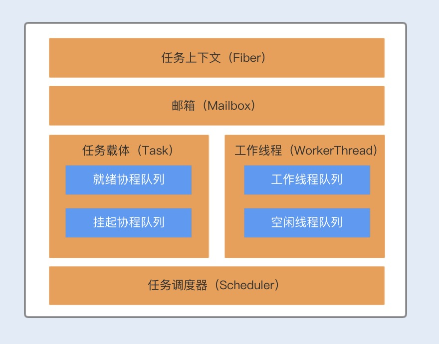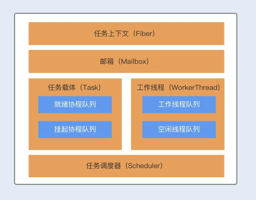 Kilim 框架包含了四个核心组件,分别为:任务载体(Task)、任务上下文(Fiber)、任务调度器(Scheduler)以及通信载体(Mailbox)。