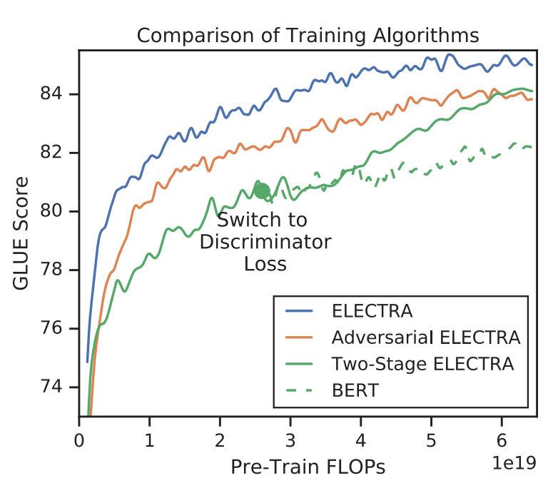 右边的图是左边的放大版,纵轴是GLUE分数,横轴是FLOPs (floating point operations),Tensorflow中提供的浮点数计算量统计。从上图可以看到,同等量级的ELECTRA是一直碾压BERT的,而且在训练更长的步数之后,达到了当时的SOTA模型——RoBERTa的效果。从左图曲线上也可以看到,ELECTRA效果还有继续上升的空间。