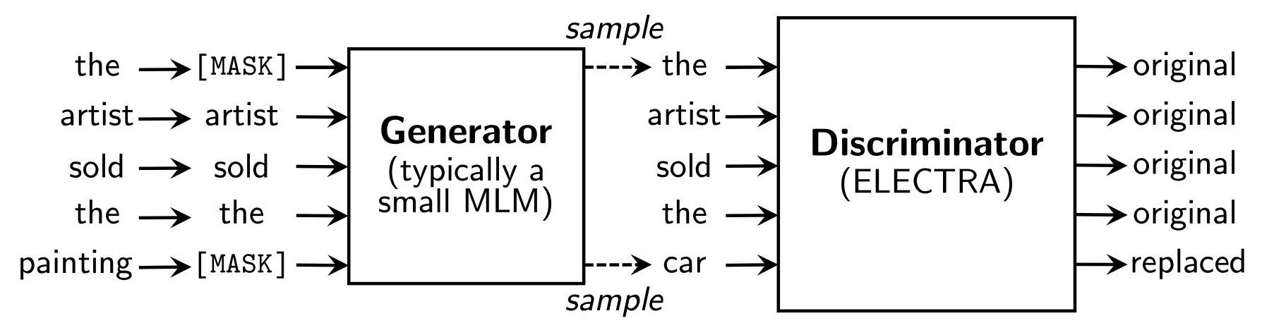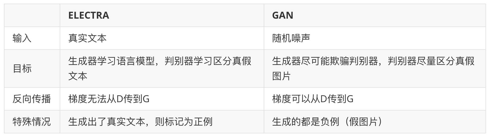 事实上,ELECTRA使用的Generator-Discriminator架构与GAN还是有不少差别,作者列出了如下几点: