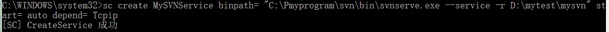 C:\WINDOWS\system32>sc create MySVNService binpath= "C:\Pmyprogram\svn\bin\svnserve.exe --service -r D:\mytest\mysvn" start= auto depend= Tcpip