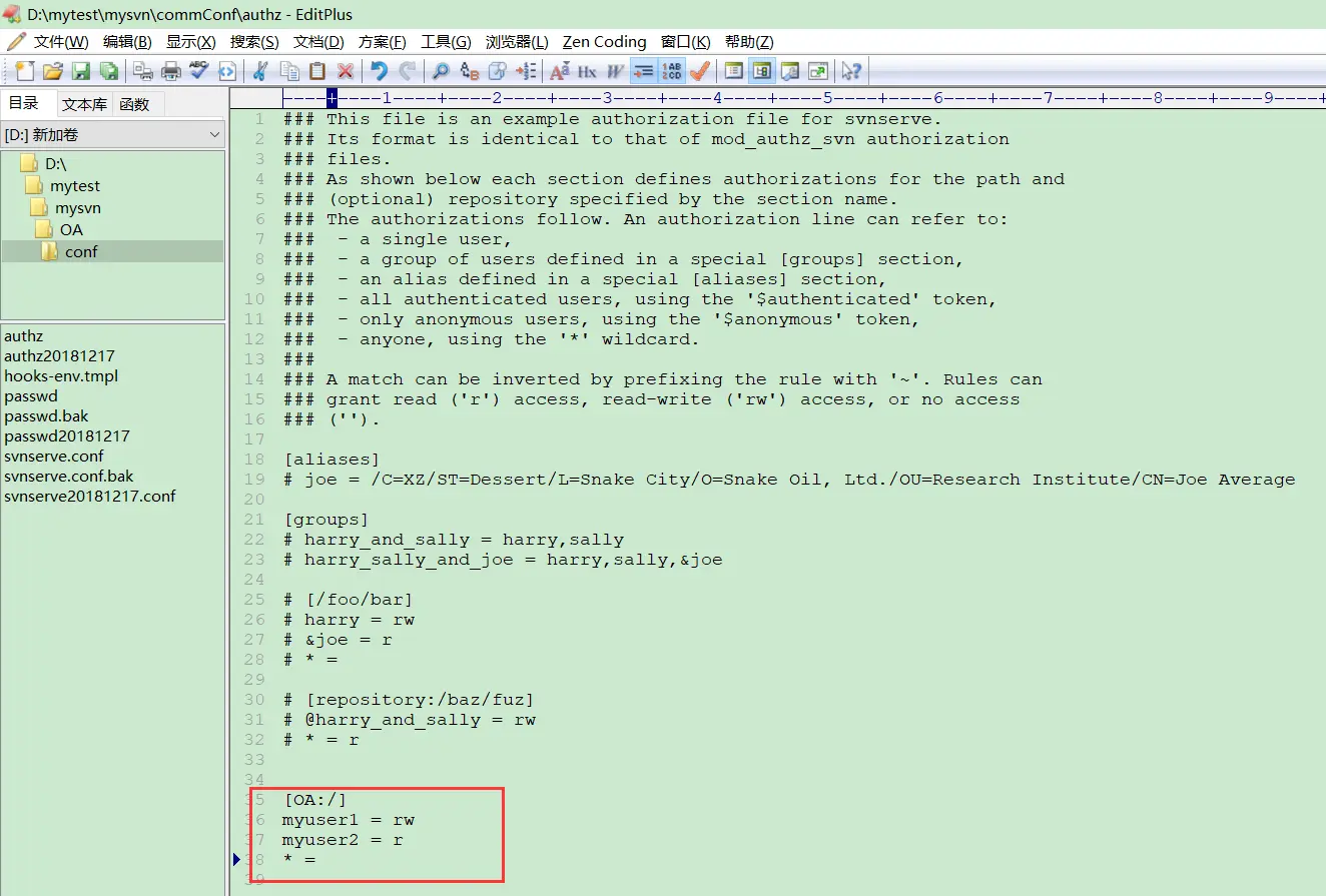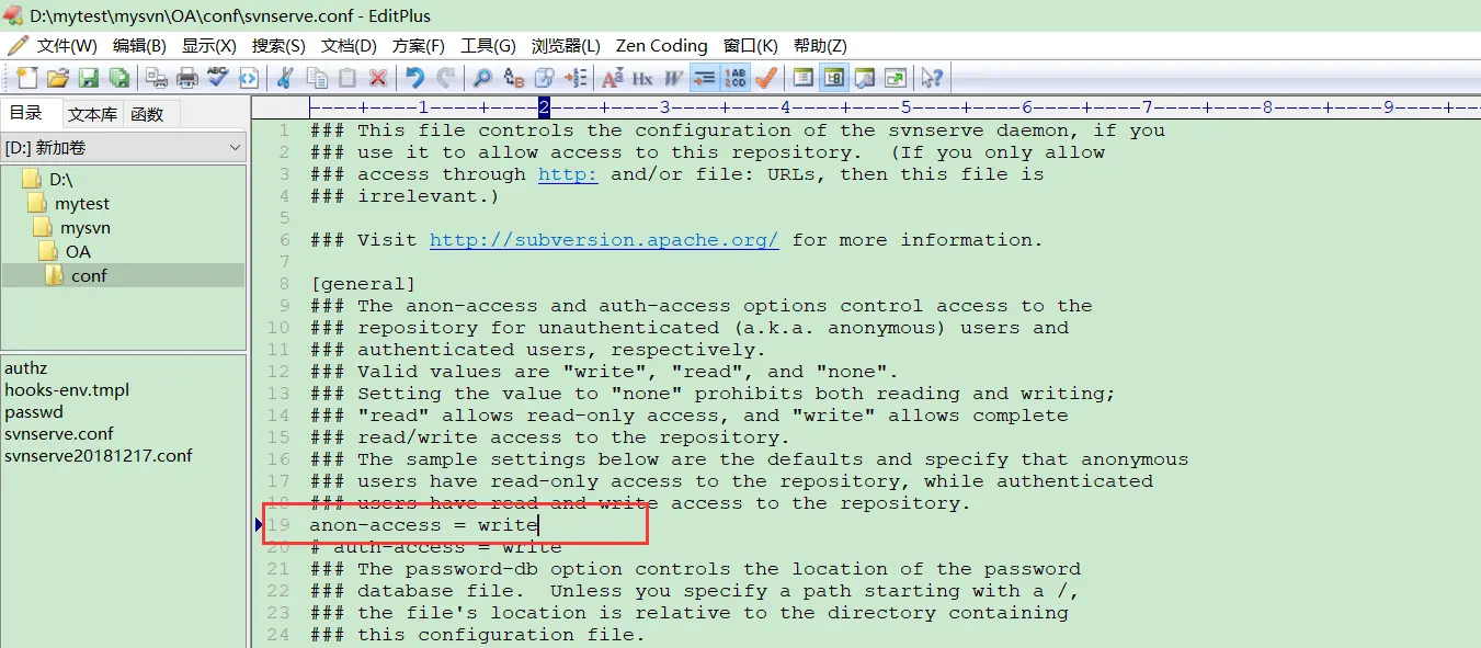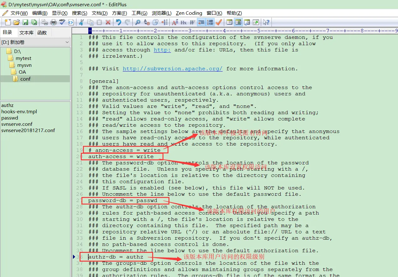 修改需要设置权限的版本库的 svnserve.conf 文件