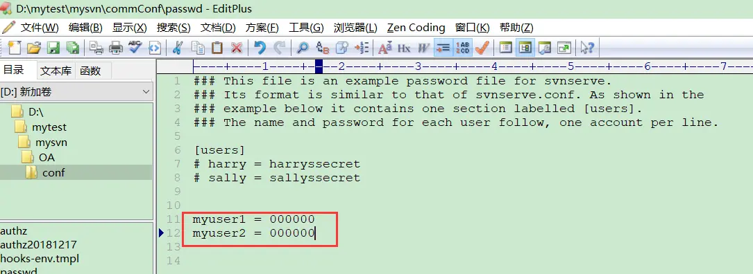 passwd:设置访问版本库的用户信息