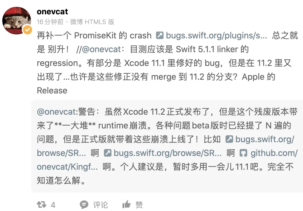 不过,据喵神和一些升级 Xcode 11.2 的用户反馈,新版本问题依然不少,所以请谨慎升级。介于今年苹果的软件质量,这应该是司空见惯的事了。