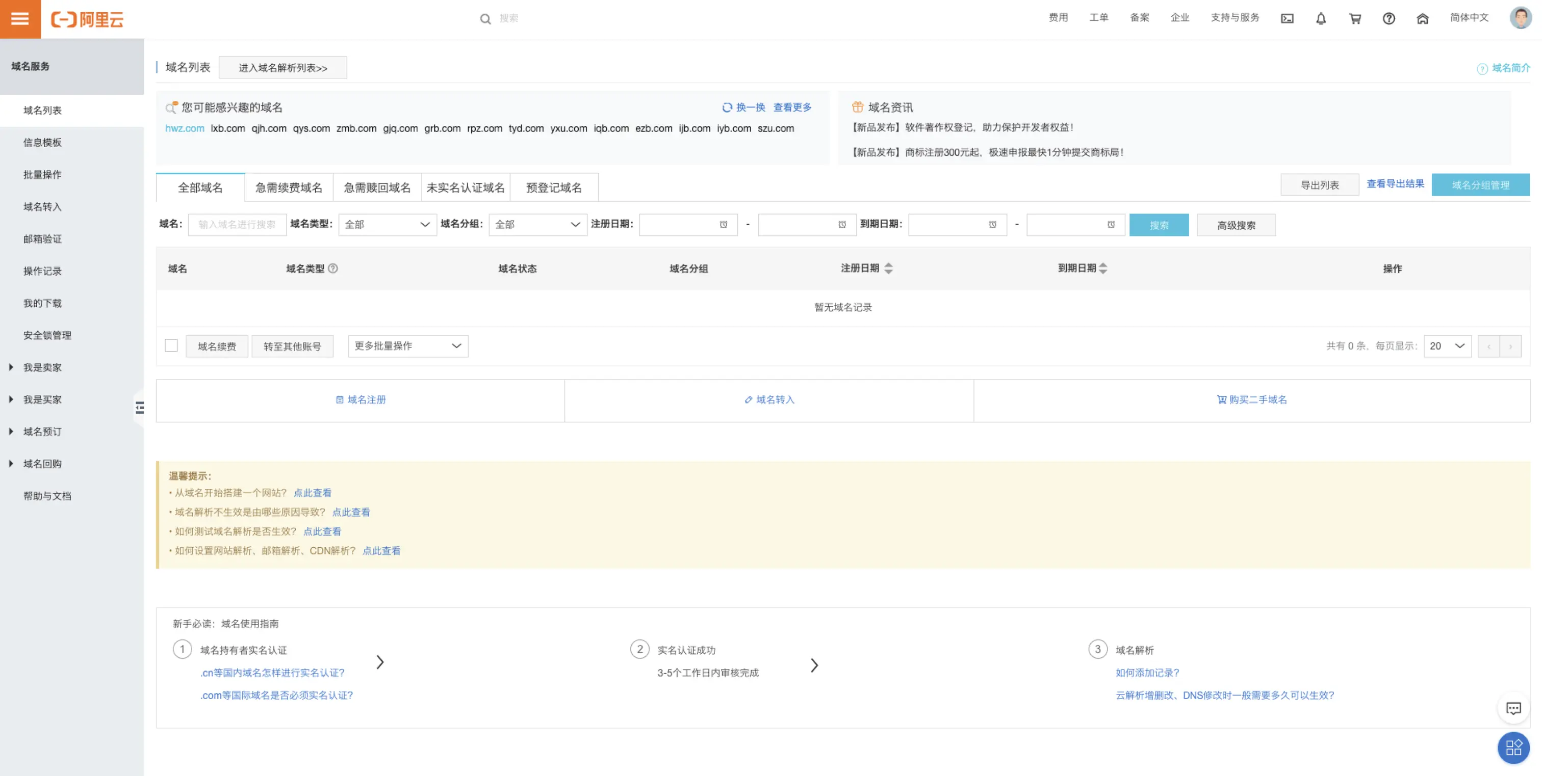 阿里云万网官方网址:wanwang.aliyun.com 也可以通过控制台的域名注册进入至本页