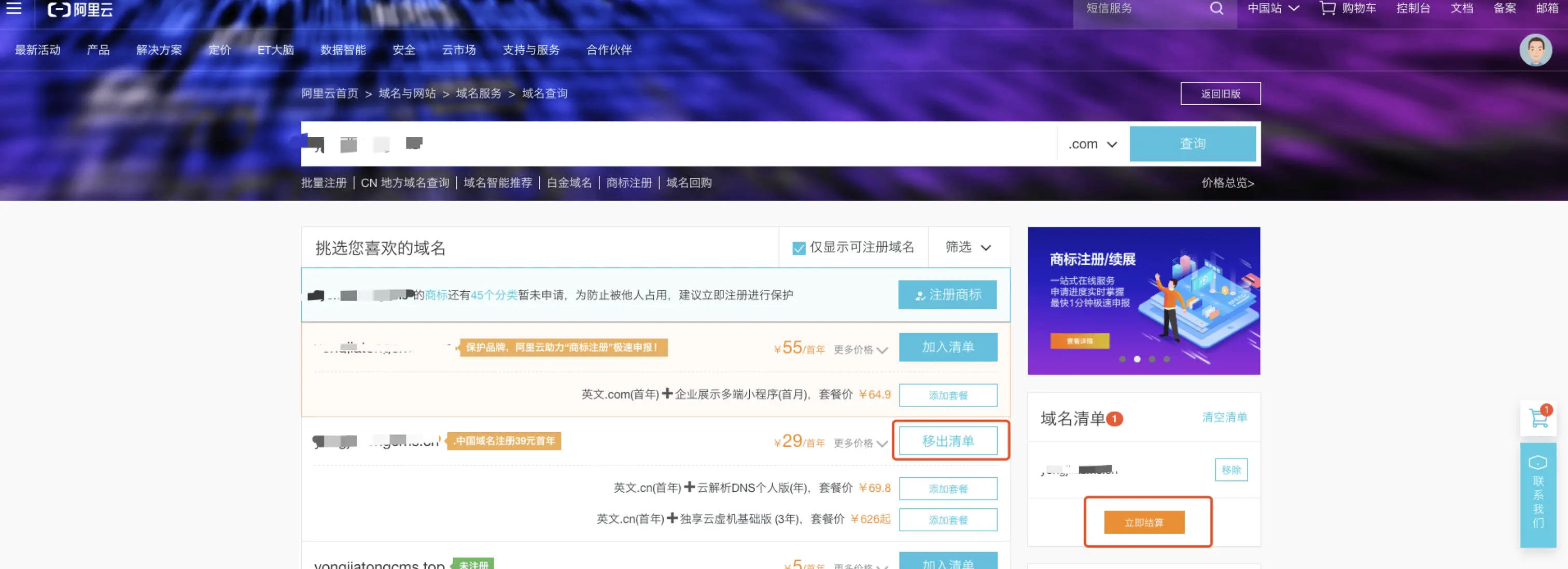 输入自己想要注册的域名,点击查域名,并加入至清单