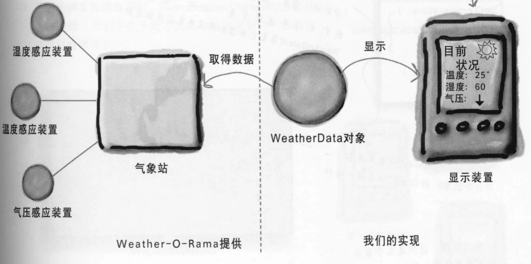 这次的引子是关于气象站的应用,案例中要建立一个应用,有三种天气预报的展现形式,使用一个WeatherObject对象获得最新测量到的天气数据,然后对三个布告板进行实时更新。并且以后可能会新加入其他的布告板,需要系统有很高的扩展性。WeatherData对象知道如何跟物理气象站联系,以取得更新的数据。WeatherData对象会随即更新三个布告板的显示:目前状况(温度、湿度、气压)、气象统计和天气预报。