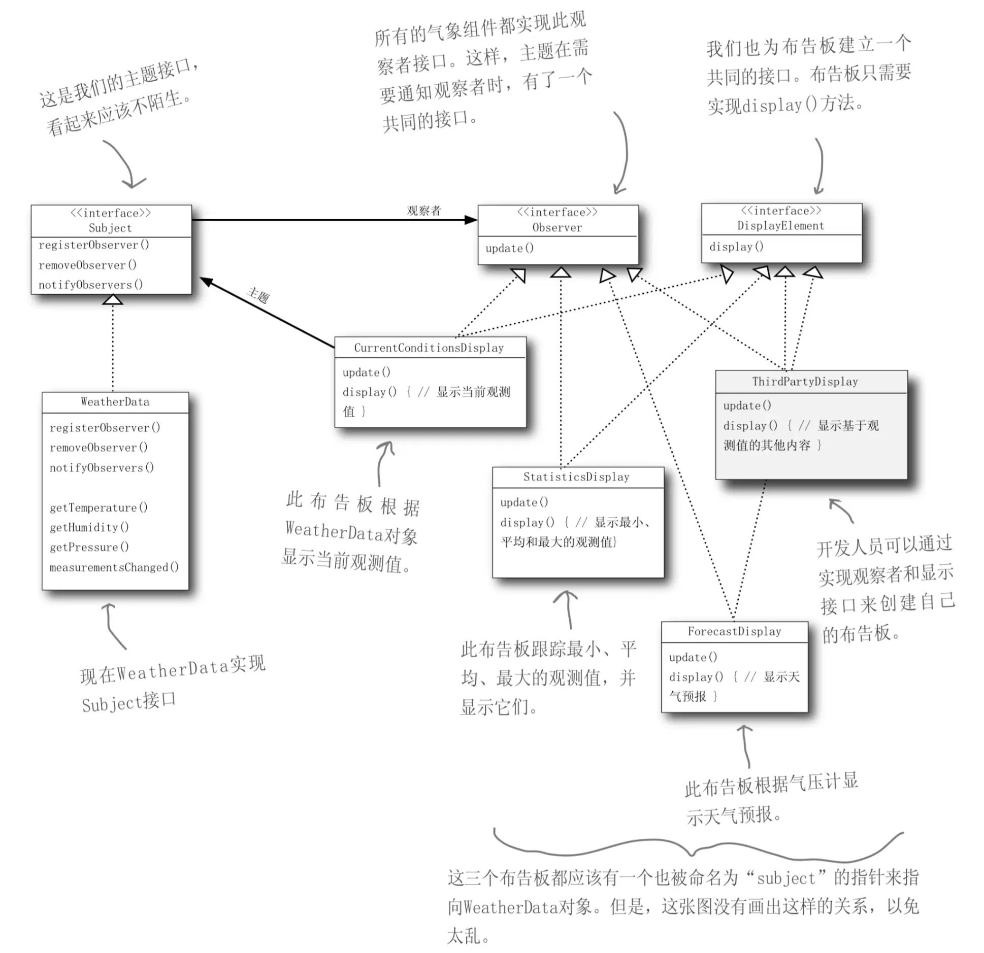2.3 我们需要实现三个使用天气数据的布告板:“目前状况”布告、“气象统计”布告、“天气预报”布告。一旦WeatherData有新的测量,这些布告必须马上更新。