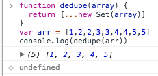 function dedupe(array) {return [...new Set(array)]}var arr = [1,2,2,3,3,4,4,5,5]