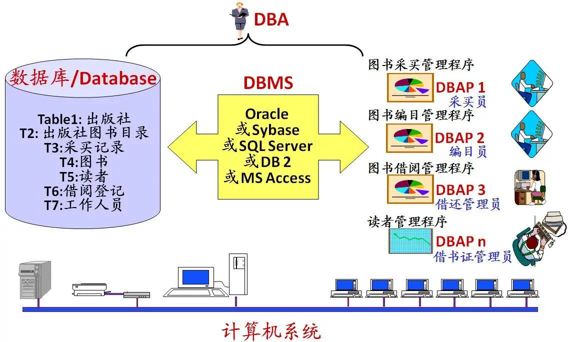 - 数据库管理员 : 数据库管理员(Database Administrator,简称DBA)负责全面管理和控制数据库系统。 数据库系统基本构成如下图所示: