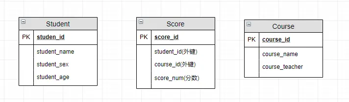 我们试着将上面的ER图转换成数据库实际的关系模型(实际设计中,我们通常会将任课教师也作为一个实体来处理):