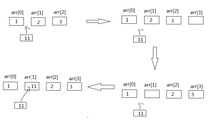 将'11'插入到第二个位置,需要在数组末尾增加一个存储空间,为了新数据'11'有位置,先将已有的数据'2'和'3'各往后移动一个存储空间,最后让出来的位置即插入新数据'11',即完成了数组的插入数组操作。