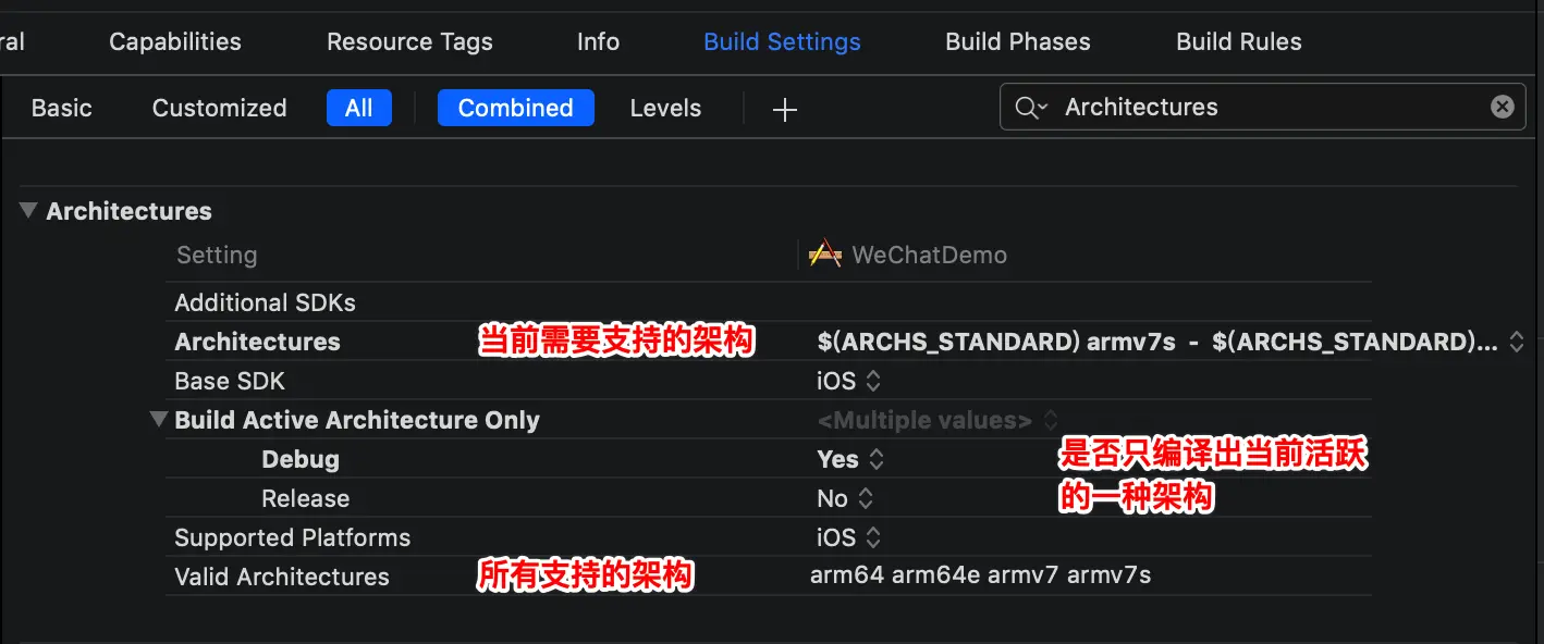 Build Active Architecture Only调试时可以设置debug模式下为Yes,只编译出一种架构;若发布debug包供测试时,可设置为NO;release 模式需要支持多种架构;