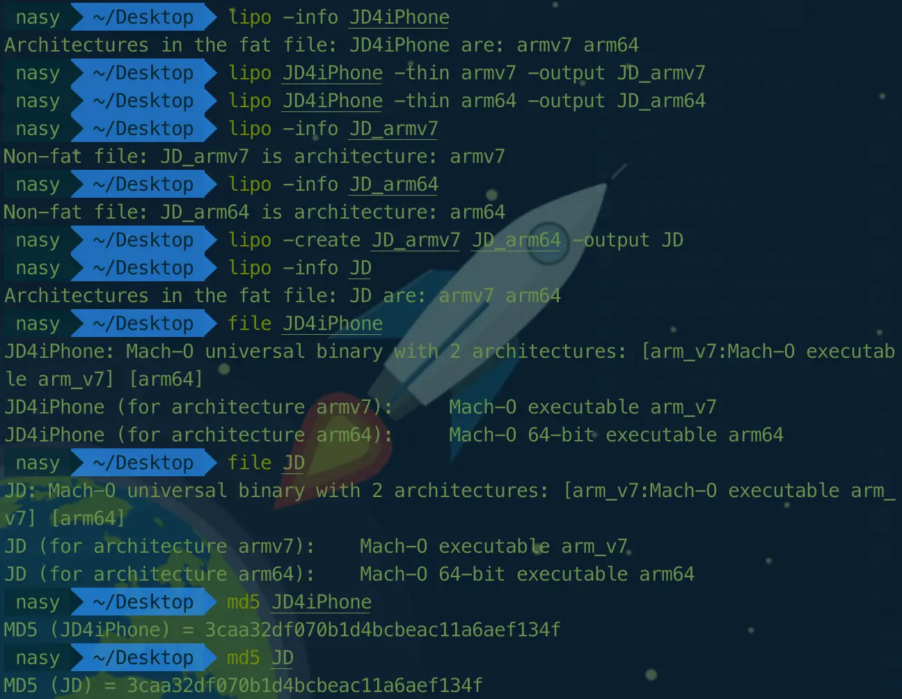 $lipo -create MachO1 MachO2 -output 输出文件路径