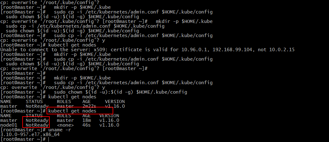 以上步骤安装完后,机器搭建起来了,但状态还是NotReady状态,如下图,master机器需要安装flanneld。