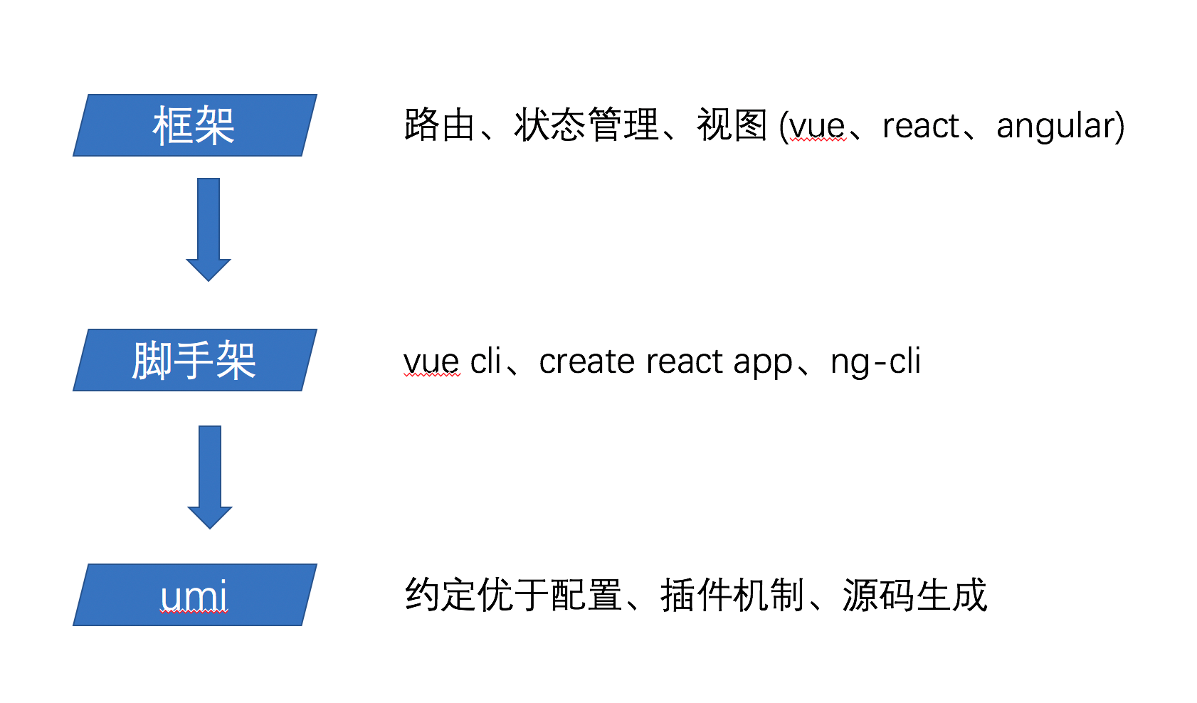 对于前端框架的工程化,基本也是从最开始的(react、vue、angular)框架开始,解决了前端领域的视图、状态管理、路由问题。随之而来vue-cli、create-react-app、angular-cli开始解放生产力,不用重复的创建项目,配置复杂的webpack,通常默认集成了webpack的最优配置。umi在前面两者的基础上更进了一步,代码生成在某种意义上等价于其他语言中的元编程,能够更大的解放生产力。