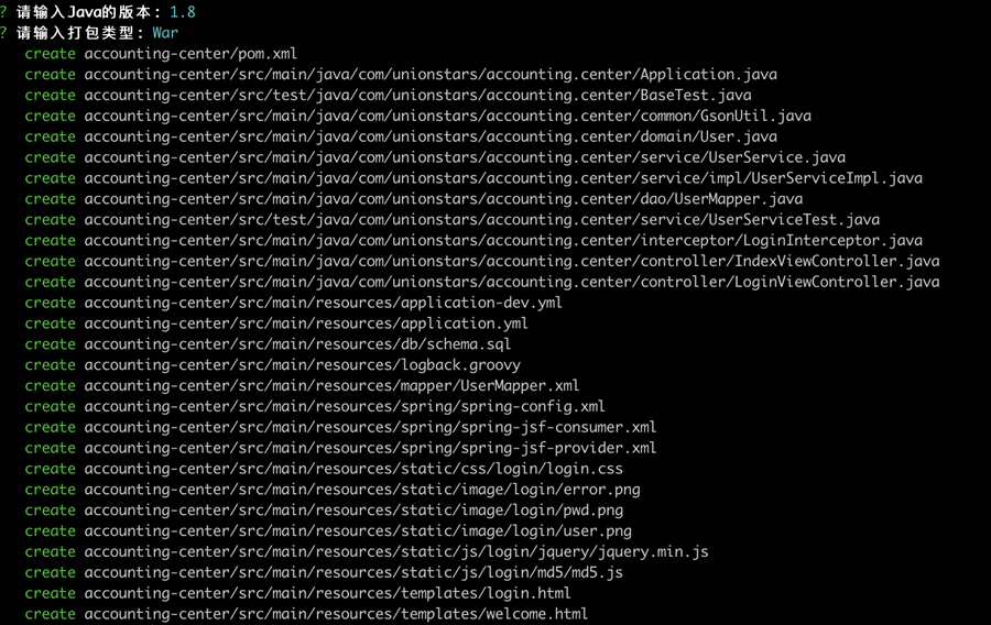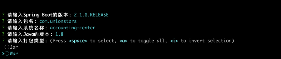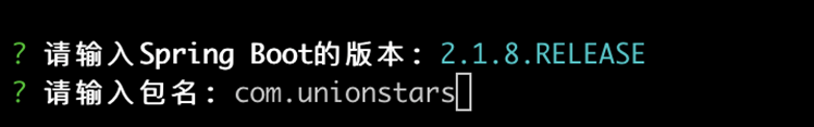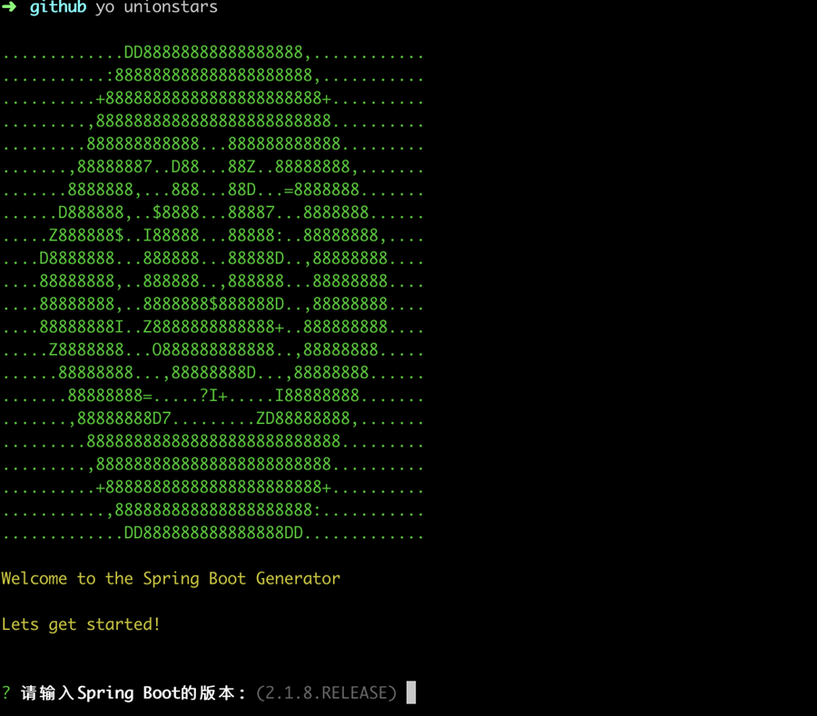 通过命令yo unionstars 运行你的脚手架模板,然后让你选择Spring Boot的版本,这里我默认是2.1.8.RELEASE.