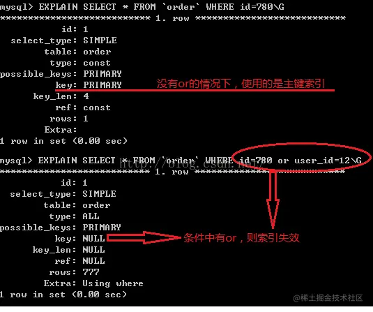 注意:要想使用or,又想让索引生效,只能将or条件中的每个列中都加上索引.
