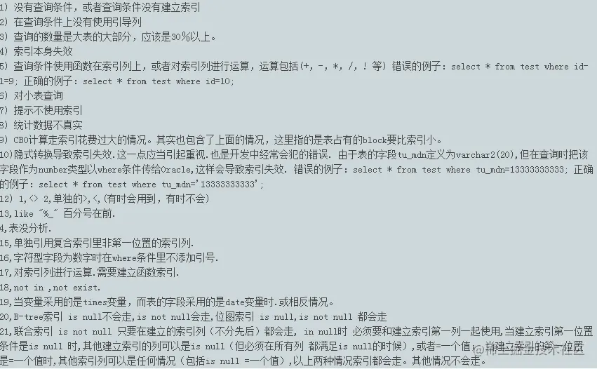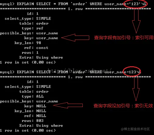 类型不一致 如果列类型是字符串,那一定要在条件中将数据使用引号引用起来,否则不使用索引