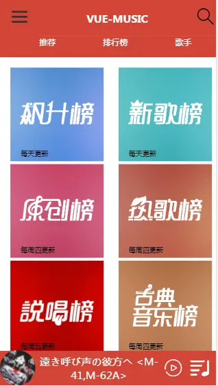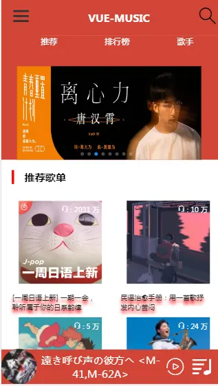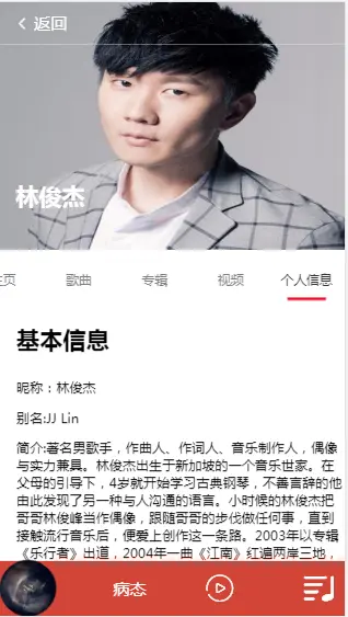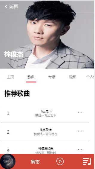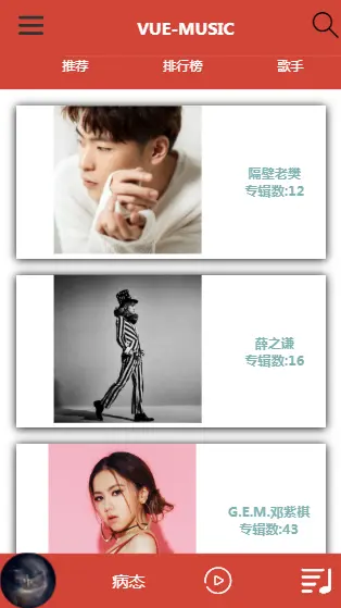 我使用了三个组件 sheet.vue ranking.vue singer.vue 来组成首页的三个部分,歌手榜用的是热门歌手数据。所以有的歌手看不到请见谅!歌手详情有五个子页面。当时做的时候本来四个就好了,结果不知道什么原因,展示的第一个页面,在从父页面获取id后,能够打印出来,但是在发送请求axios时,id就变成undefined了,我没有找到其他好的解决方法,就多加了个无关紧要的页面解决这个BUG.