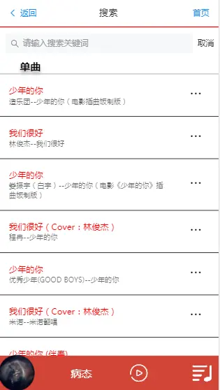 点击搜索进入热门搜索,会根据当时的热度进行排行,再次点击会显示搜索结果,可以直接进行播放.