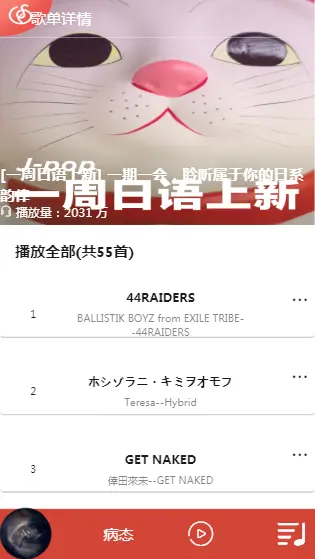 歌单的详情基本都是一样的,我使用了一个组件来完成 Detail.vue,该页面主要展示歌单里面的歌曲,点击可以播放,收藏歌单在登录用户后,点击用户信息可以看到。