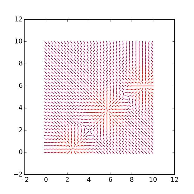 接下来,沿着每个轴增加10个点(二维空间),即在坐标轴上从0到10,也给每个点设置-0.25至0.25的电荷。然后,运行一个循环,并依据其坐标(轨迹)绘制点: