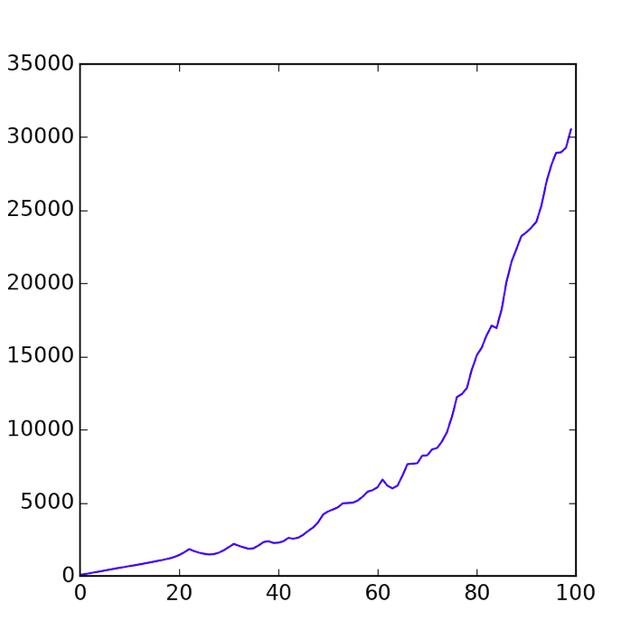 这是在任意给定时间中的速度总和。正如你所看到的,随着时间的推移,它们在缓慢加速。
