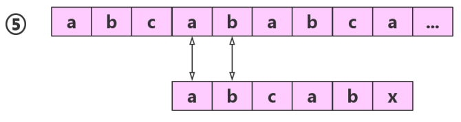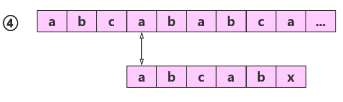 如果子串为abcabx,主串为abcababcax,在第一轮中,前五个元素子主串分别相匹配,第六个元素位置出错,按照朴素模式匹配,我们需要拿子串首元素a,依次与主串中的a后面的元素匹配,但是子串前面三个字符abc是不相等的,按照我们第一种情况的经验,就直接跳过这些步骤了,所有我们直接拿 子串a与 主串第四个元素a进行比较就可以了,但是我们发现,子串中出错的位置x前的串 abcab 的前缀和后缀都是 ab,既然第一轮的时候,已经匹配成功,那就意味着,子串中的 第一第二个元素ab一定与 主串中 第四第五个元素 ab相等,所以这个步骤也可以省略,也就直接可以拿子串前缀ab后面的c开始于a进行比对,这也就是我们上面图中例子的详细思路