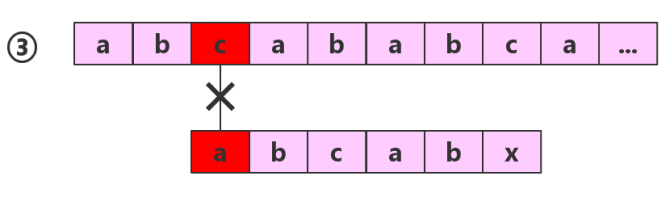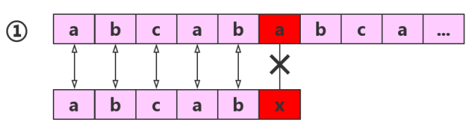 ① 中前五个元素,均互相匹配,知道第六个元素才匹配失败,按照BF算法来说,就直接进行 ② ③ 操作,但是,我们可以发现,子串中的前三个元素 a b c 均不是相同的,但是在 ① 中已经与 主串相匹配,所以 子串分别与主串中的第二 第三个元素匹配 一定是不匹配的,所以图中的 ② ③ 均可以省略