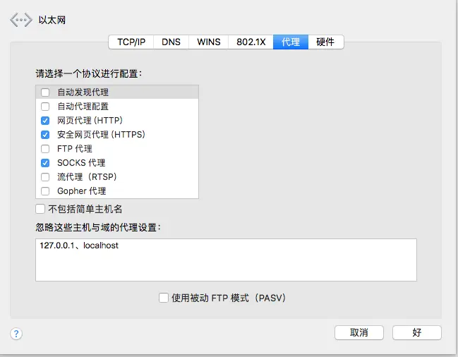 3,网络代理软件设置后是否生效(可以从系统偏好 >> 网络 >> 高级 >> 代理去查看);