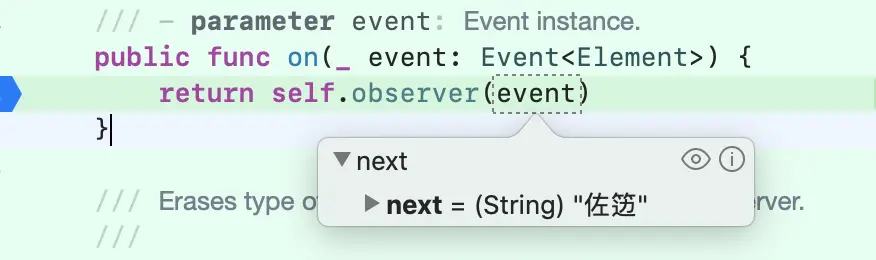 这里已经把对应的obserber的类型已经描述的很清晰了。obserber为AnyObserver类型,且遵循ObserverType协议,调用的onNext()方法就是ObserverType协议里的方法(查看一下AnyObserver类的源码便知)。