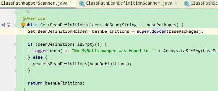 Set<BeanDefinitionHolder> beanDefinitions = super.doScan(basePackages);