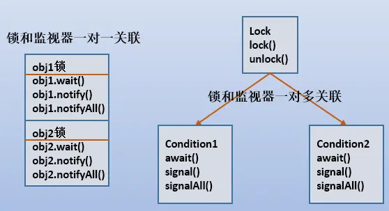 从JDK 1.5开始,java提供了java.util.concurrent.locks包,这个包中提供了Lock接口、Condition接口和ReadWriteLock接口,前两个接口将锁和监视器方法(睡眠、唤醒操作)解耦了。其中Lock接口只提供锁,通过锁方法newConditon()可以生成一个或多个与该锁关联的监视器,每个监视器都有自己的睡眠、唤醒方法。也就是说Lock替代了synchronized方法和同步代码块的使用,Condition替代了Object监视器方法的使用。 如下图: