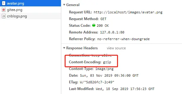通过 url 访问,查看消息头就可以看到已经开启 gzip 压缩了:Content-Encoding: gzip
