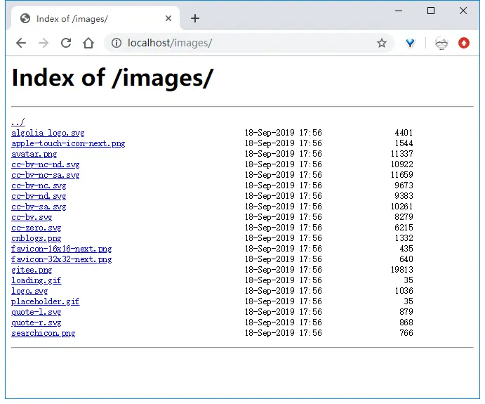 修改后,重启 nginx,以目录结构中的 images 目录为例,访问 url:localhost/images/,展示情况如下图: