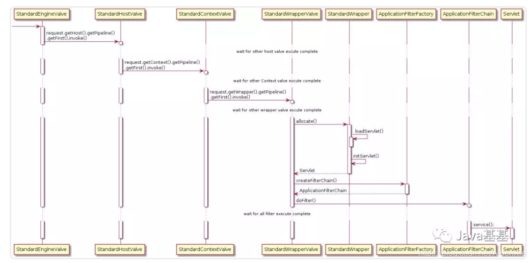 - 需要注意的是,基本上每一个容器的 StandardPipeline 上都会有多个已注册的 Valve,我们只关注每个容器的 Basic Valve。其他 Valve 都是在 Basic Valve 前执行。