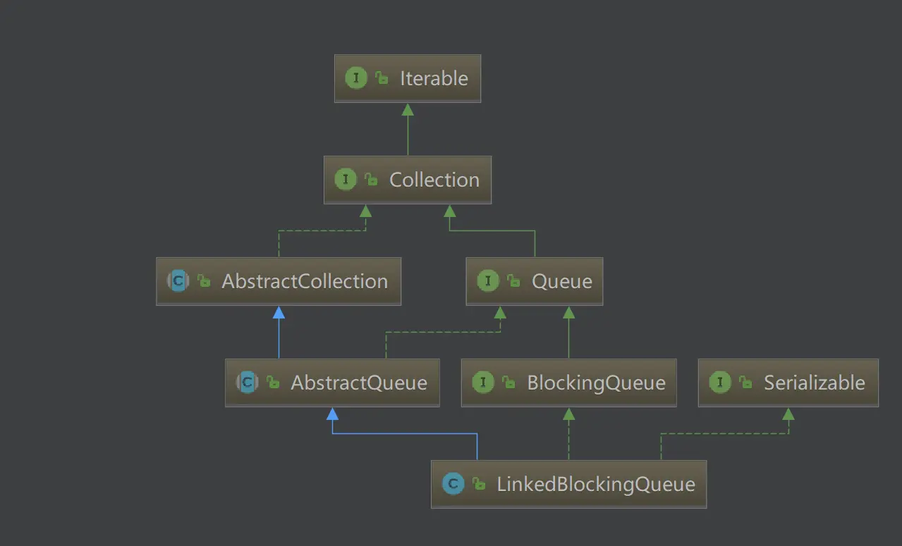 我们先来看看LinkedBlockingQueue的继承体系。使用IntelliJ IDEA查看类的继承关系图形