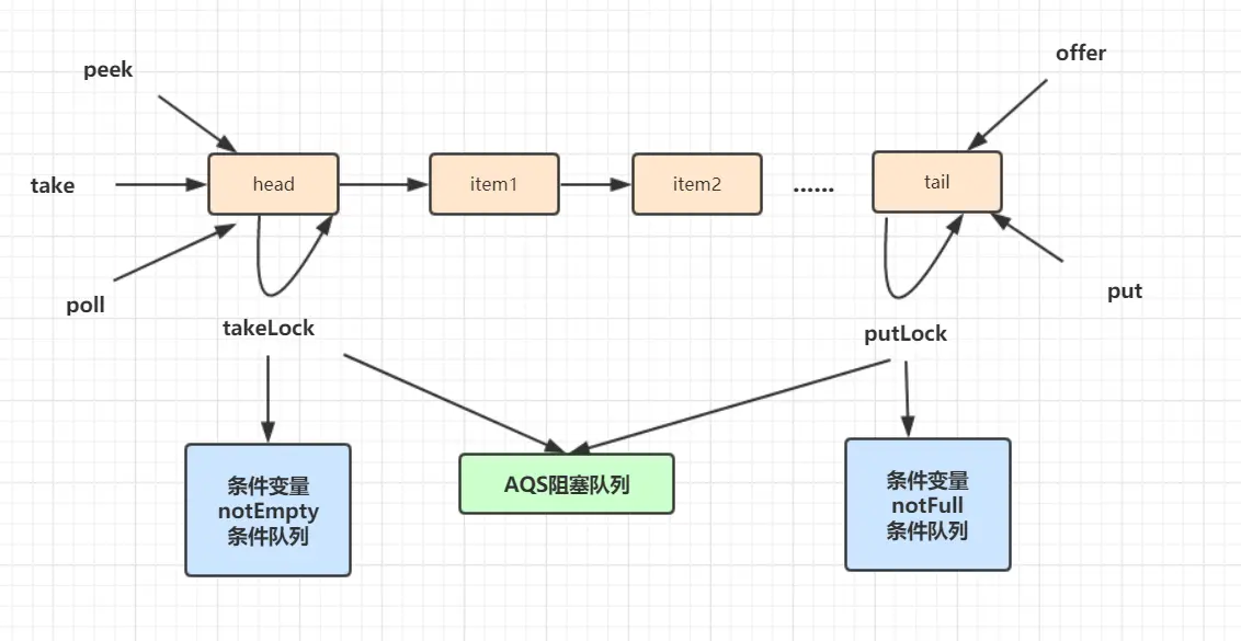 - LinkedBlockingQueue有两把ReentrantLock的锁,一把控制元素入队,一把控制出队,保证在并发情况下的线程安全。